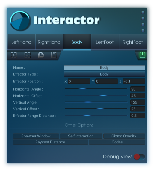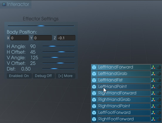 After Interactor is added to the character, you need Effectors for each interactable player part. Effectors have their rules (angles, ranges etc) that determine if their interaction objects in the Sphere trigger are in a good position to interact. Also, they're the interaction handlers for that specific body part. For instance, a left hand effector will look at all left hand targets in the area, check their positions for the rules you set, and manage the interaction process until the end.