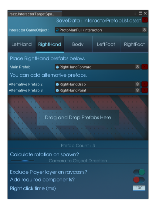When you right click in the SceneView, you'll see the targets you added on InteractorTargetSpawner. If you select any of them, it will be spawned on the clicked gameobject with the rotations & position offset you adjusted before. But this gameobject also needs InteractorObject component so add it and adjust all the settings as you desire. Now you should be able to interact with it in Play Mode. Now you can delete its child objects including targets you spawned, drag it into project window to create another prefab. Assign it into Spawn Presets section of the InteractorTargetSpawner. From now on, you can spawn your targets with Add Components option selected. It's name will show up as preset and same settings will be copied to clicked object.