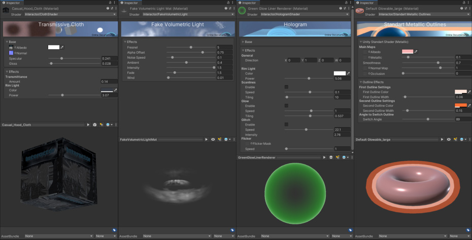 Outlines shader is the main material for interaction objects in examples. When objects get activated their properties adjust its glow to notify the user. It has two different glowing options and they can be set with different colors as well as with different widths. I scripted it to look exactly the same with Unity Standart Metallic shader so when not glowing, it will just look exactly the same with Standart materials.