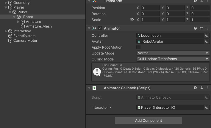 And second, Game Creator puts the Animator component on an unusual place. But normally Animator need to be at the same place with InteractorIK to get OnAnimatorIK calls on time. To fix that, put AnimatorCallback.cs component on the same object with your Animator, and assign InteractorIK to its slot. That's it; you're all set!
